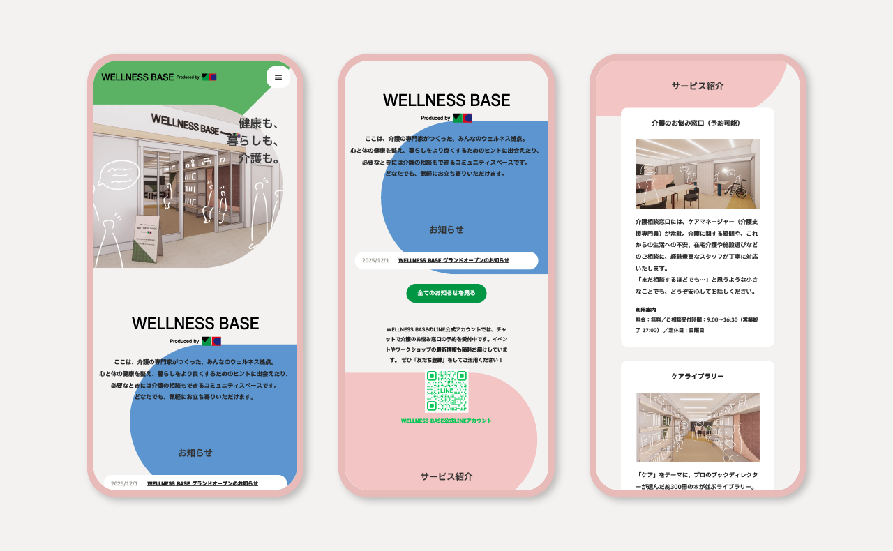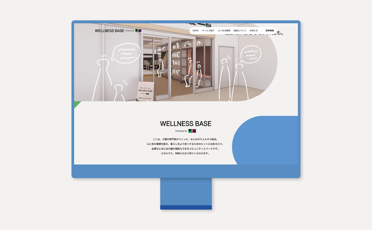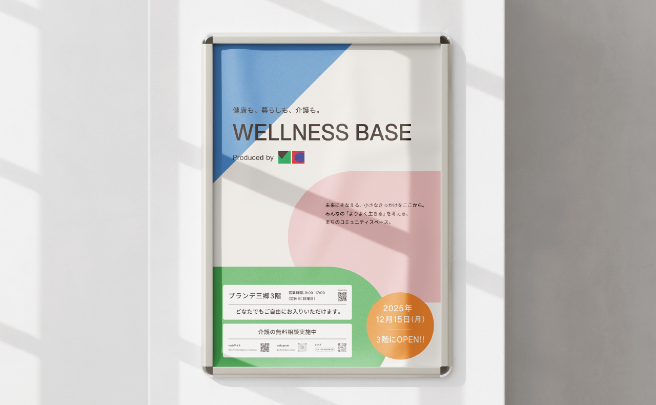 施設名として定めた「WELLNESS BASE」も、介護を単独のテーマとして扱うのではなく、「より良く生きる」というウェルネスの文脈の中に位置づけたいという思想を象徴するネーミングとして開発しました。