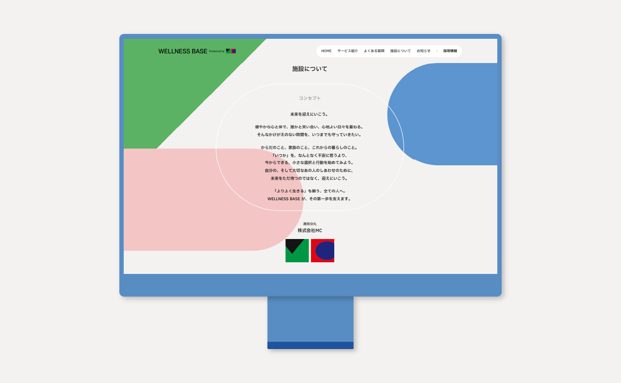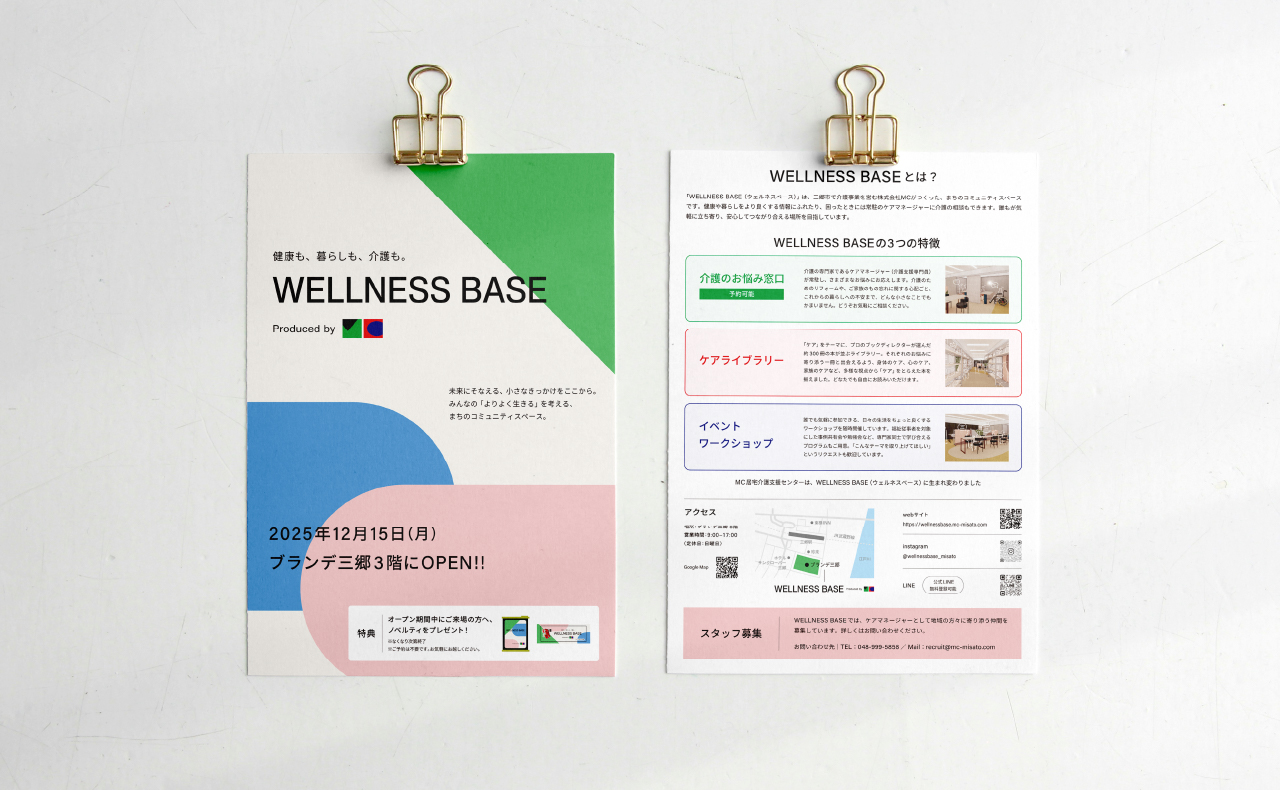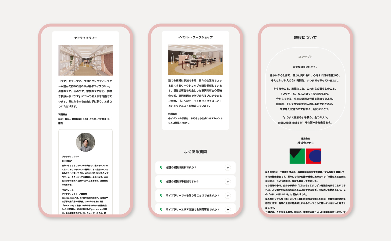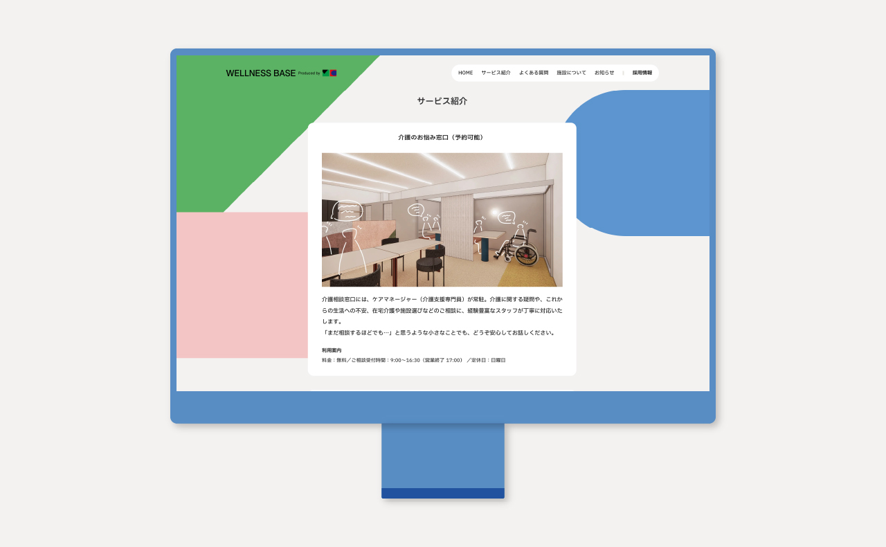 施設名として定めた「WELLNESS BASE」も、介護を単独のテーマとして扱うのではなく、「より良く生きる」というウェルネスの文脈の中に位置づけたいという思想を象徴するネーミングとして開発しました。