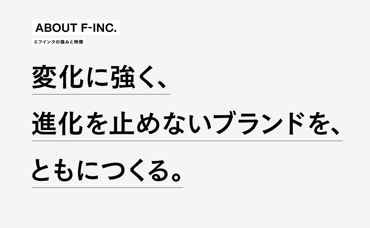 2023年8月に企業理念やサービスの見直しをはじめ、ブランドロゴやWEBサイトの一新など、会社全体のセルフ「リブランディング」を行ったブランディングカンパニー「エフインク(F-INC.)」。構想から数年越しで行われたリブランディングの目的や込めた想い、デザイン表現についてなど、数多くのブランドのリブランディングを手がけてきたブランディング会社ならではの視点を交えながら全4回の記事でお届けいたします。